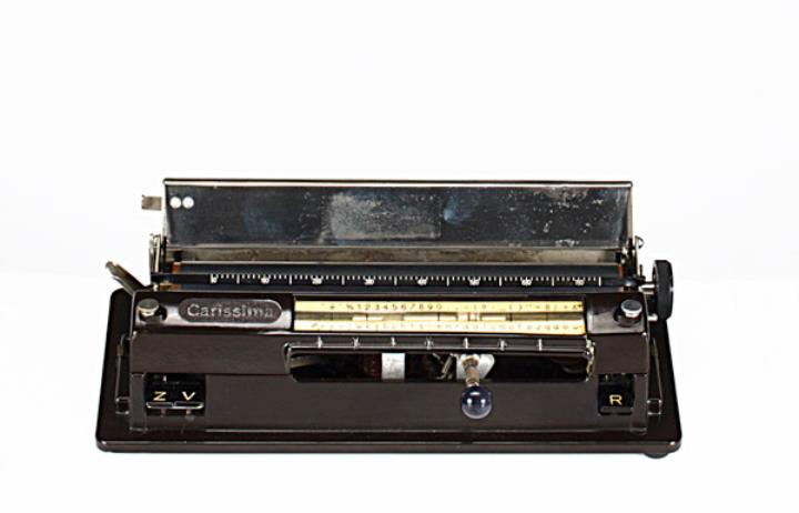 Schreibmaschine Carissima Eigenschaften: Zeiger/Eintaster; Typenzylinder (87 Zeichen), Vorderanschlag, doppelte Umschaltung, Farbband Konstrukteur: Edgar Hofmann andere Bezeichnung: Bee, Seriennummer 2211