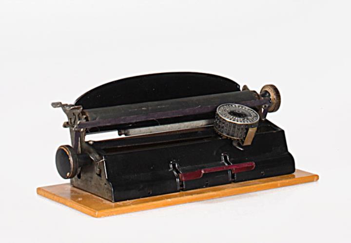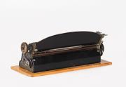 Schreibmaschine Aktiv; auf Holzbasis montiert Eigenschaften: Typenzylinder (90 Zeichen), Vorderanschlag, doppelte Umschaltung, Farbband Besonderheit: horizontal auf einer Schiene laufender Typenzylinder (ähnlich späterer Kugelkopfschreibmaschinen) weite Bezeichnung: Active, Exact, Velox, Seriennummer 3617