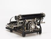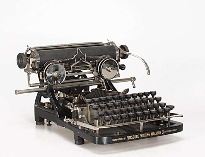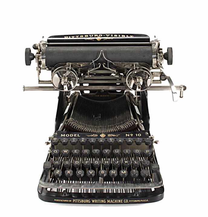 Schreibmaschine Pittsburg Modell 10 Eigenschaften: Typenhebel waagrecht liegend, Vorderanschlag, einfache Umschaltung (Segment), Farbband Tastatur: universal, vierreihig, 44 Schreibtasten Konstrukteur: James Denny Daugherty Besonderheit: aufrecht positionierte Farbbandspulen, Seriennummer 24034