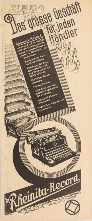 Werbeanzeige für Schreibmaschine Rheinmetall Rheinita Record monochrom