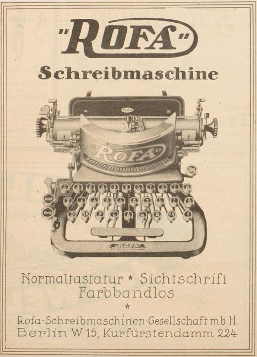 Werbeanzeige für Schreibmaschine Rofa monochrom
