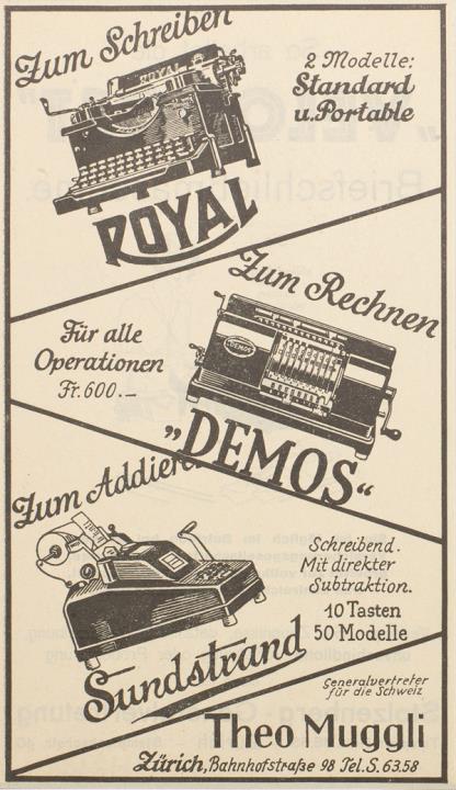 Werbeanzeige für Schreibmaschinen und Rechenmaschinen der Büromaschinenhandlung Theo Muggli monochrom