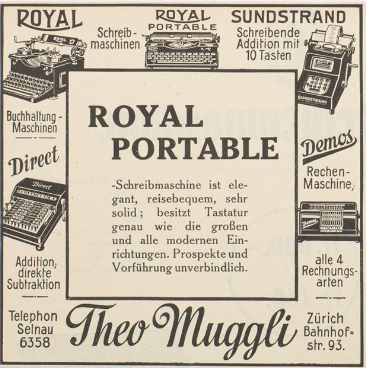 Werbeanzeige für tragbare Schreibmaschine Royal monochrom
