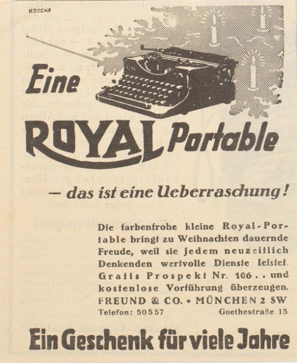 Werbeanzeige für tragbare Schreibmaschine Royal monochrom