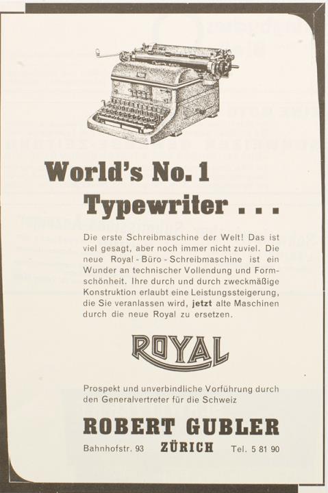 Werbeanzeige für Schreibmaschine Royal monchrom