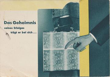 Antwortpostkarte, Faltprospekt; Grafik, Fotografie, polychrom Nr. S 7051 G py TGE Rückseite: Mann mit Schreibmaschinenkoffer Vorderseite: adressiert an Firma Schönemann, Hasserode; Briefmarke Deutsches Reich 3 RPf.; Poststempel Magdeburg/19.12.1934 Im Inneren Werbung für Schreibmaschine Erika und Antwortkarte mit vorgedruckter Anschrift Willy Pfund vorm. Albert Osterwald GmbH, Magdeburg