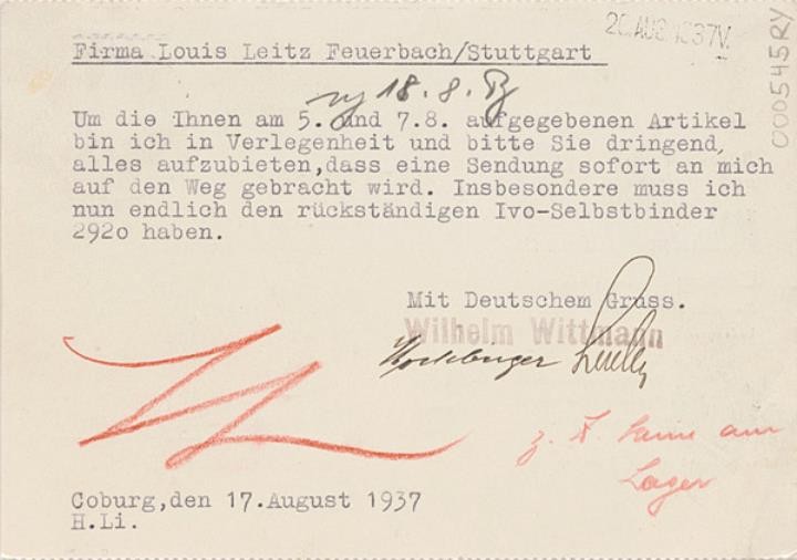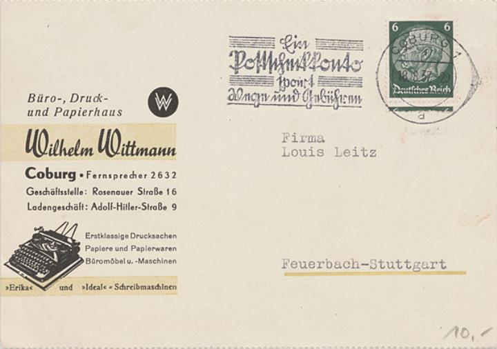 Postkarte mit Werbebild; Grafik, polychrom Vorderseite: adressiert an Firma Leitz, Feuerbach-Stuttgart; Briefmarke Deutsches Reich 6 RPf.; Poststempel Coburg/18.8.1937 Rückseite beschrieben (Maschinenschrift)