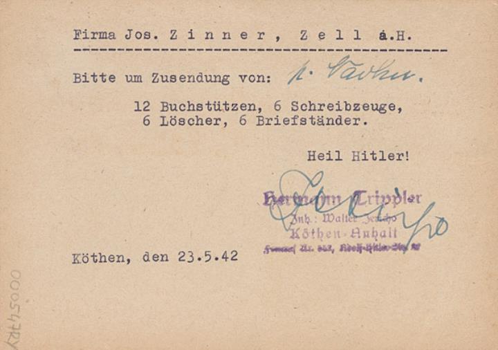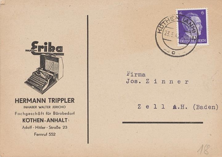 Postkarte mit Werbebild; Grafik, monochrom Vorderseite: adressiert an Firma Zinner, Zell a.H.; Briefmarke Deutsches Reich 6 RPf.; Poststempel Köthen/23.5.1942 Rückseite beschrieben (Maschinenschrift)
