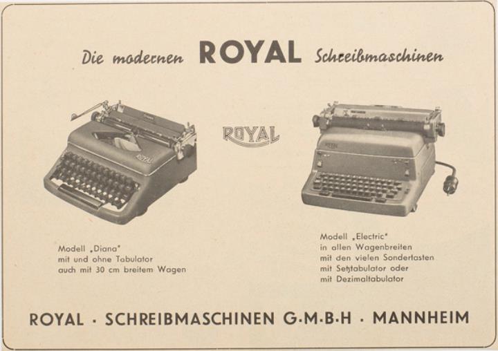 Werbeanzeige für Schreibmaschine Royal Diana und Electric monochrom