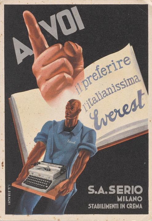Werbepostkarte; Grafik, polychrom; Grafik: Ippolito Umberto Biraghi Rückseite: Mann/Arbeiter mit Schreibmaschine Everest Vorderseite nicht beschrieben