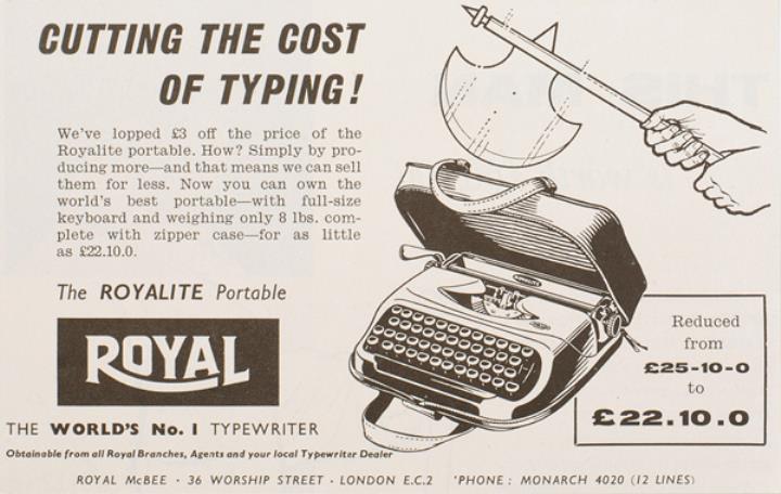 Werbeanzeige für Schreibmaschine Royal Royalite monochrom