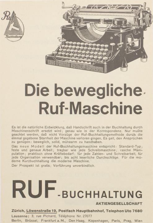 Werbeanzeige für Schreib- und Buchungsmaschine Ruf monochrom