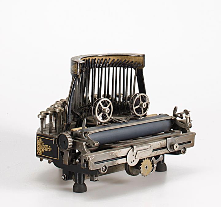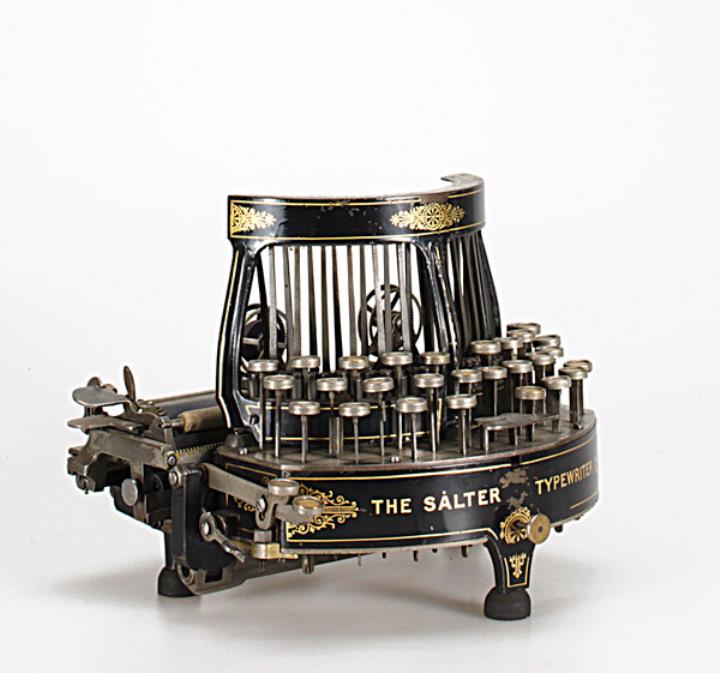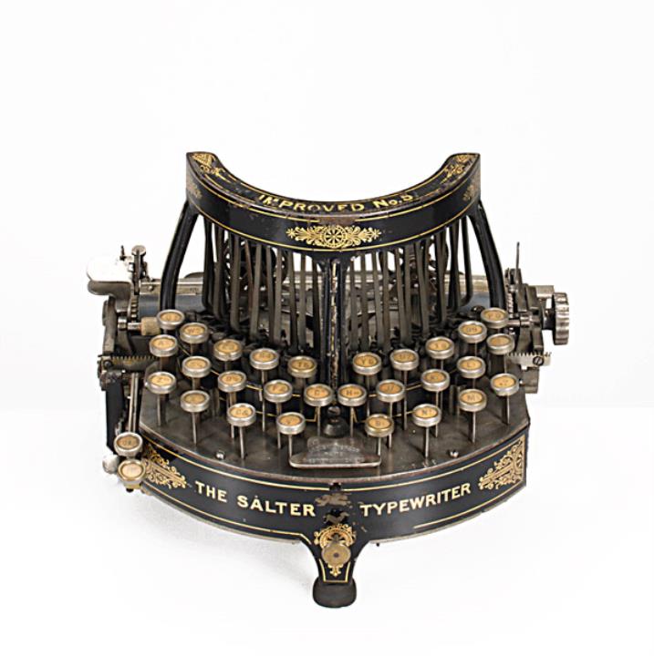 Schreibmaschine Salter Modell 5 (improved) Eigenschaften: Typenhebel stehend, Oberanschlag, doppelte Umschaltung, Farbband Tastatur: halbrund, ideal, dreireihig, 28 Schreibtasten Konstrukteur: James Sam Foley, John Henry Birch, Seriennummer 2688