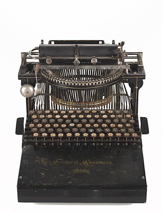 Schreibmaschine Frister & Rossmann Eigenschaften: Typenhebel, Unteranschlag, Volltastatur, Farbband Tastatur: ideal, sechsreihig, 78 Schreibtasten, kyrillisch Konstrukteur: George Washington Newton Yost, Franz Xaver Wagner, James Densmore, Walter J. Barron Besonderheit: autorisierter Nachbau der Caligraph; Tastenhebel aus Holz, seitliche Leertasten, Seriennummer 435