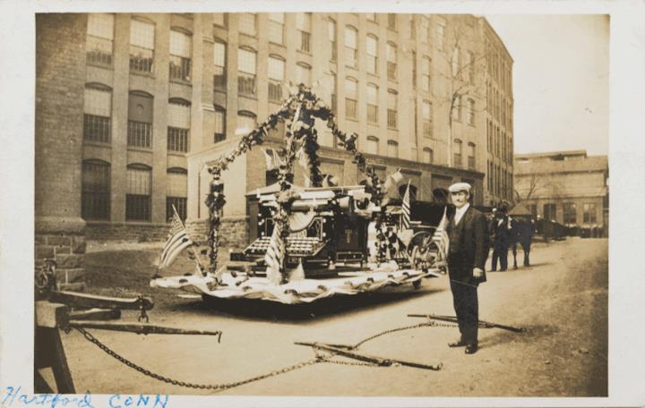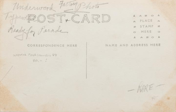 Illustrierte Postkarte; Fotografie, monochrom; Rückseite: Straßenansicht mit festlich geschmücktem Wagen und Schreibmaschine Underwood in Großformat, Mann mit Blick zum Betrachter; unten links handschriftlicher Vermerk: Hartford CONN; Vorderseite mit handschriftlichem Vermerk: Underwood Typewriter. Factory Photo. Ready for Parade