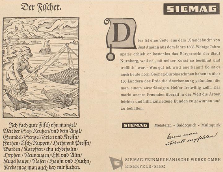 Werbeanzeige für Schreibmaschine Siemag; mit Holzstich-Abbildung monochrom