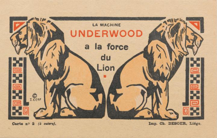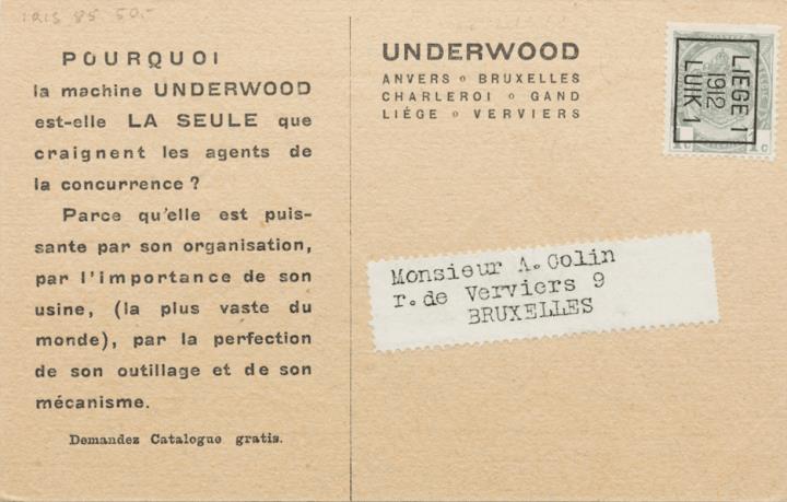 Werbepostkarte; Grafik, polychrom; Carte n. 2, Grafik: I. Cerf Rückseite: zwei Löwen mit dem Rücken zueinander Vorderseite: Werbetext, adressiert an Monsieur Colin, Bruxelles; Briefmarke Postes Belgique 1 c; Poststempel Liege/1912