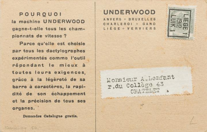 Werbepostkarte; Grafik, polychrom; Carte n. 6, Grafik: I. Cerf Rückseite: zwei Adler mit Schreibmaschine Underwood Vorderseite: Werbetext, adressiert an Monsieur Colin, Bruxelles; Briefmarke Postes Belgique 1 c; Poststempel Liege/1912