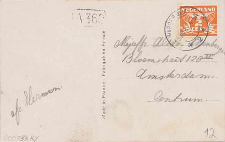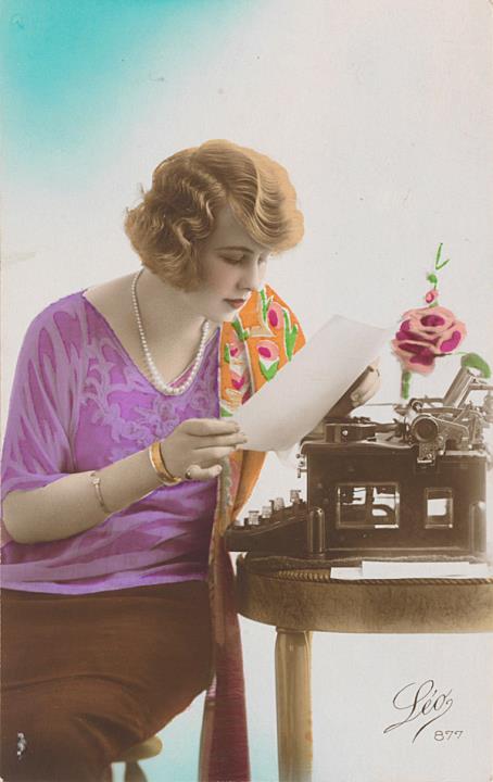 Illustrierte Postkarte; Fotografie, koloriert; Serie Leo 877 Rückseite: Frau mit Schreibmaschine, Blume als Dekoration Vorderseite: beschrieben, adressiert; Briefmarke Nederland 2 Cent; Poststempel Harderwijk/15 VIII 1927