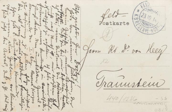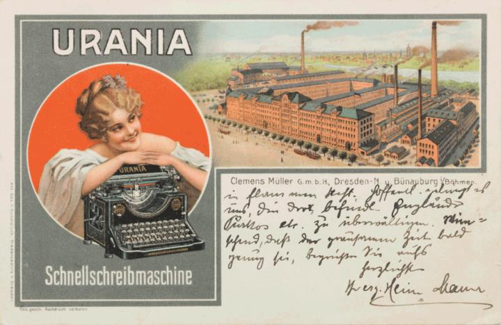 Werbepostkarte; Grafik, polychrom; Rückseite: Frau mit Schreibmaschine Urania, daneben Ansicht der Schreibmaschinenwerke, Leerbereich beschrieben; Vorderseite: beschrieben, adressiert an Herrn Heey, Traunstein; Poststempel 23.10.14