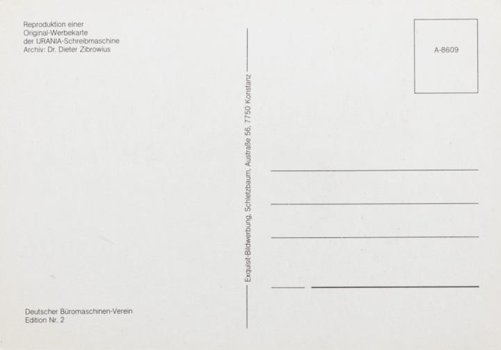 Werbepostkarte; Nachdruck, polychrom; Rückseite: Frau mit Schreibmaschine Urania, daneben Ansicht der Schreibmaschinenwerke; Vorderseite nicht beschrieben