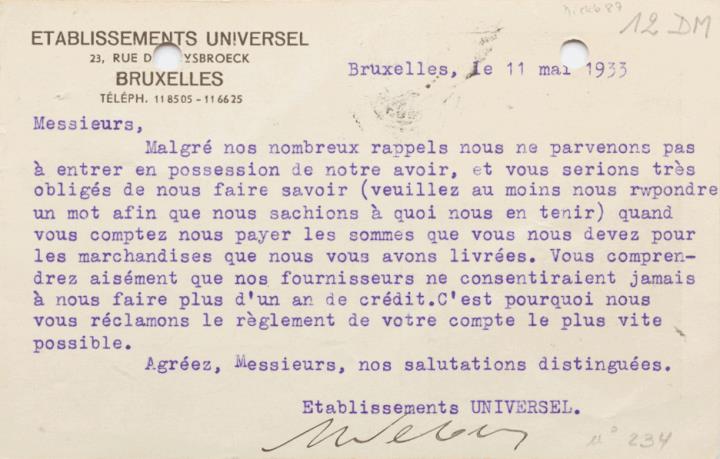Postkarte mit Werbebild; Grafik, polychrom; Vorderseite: rauchender Mann mit Reiseschreibmaschine Urania auf einem Boot; adressiert an Administration Communale de Seneffe; Briefmarke Postes Belgique 50 c; Poststempel Bruxelles/19-20 II.V 1933 Rückseite beschrieben, datiert 11 mai 1933