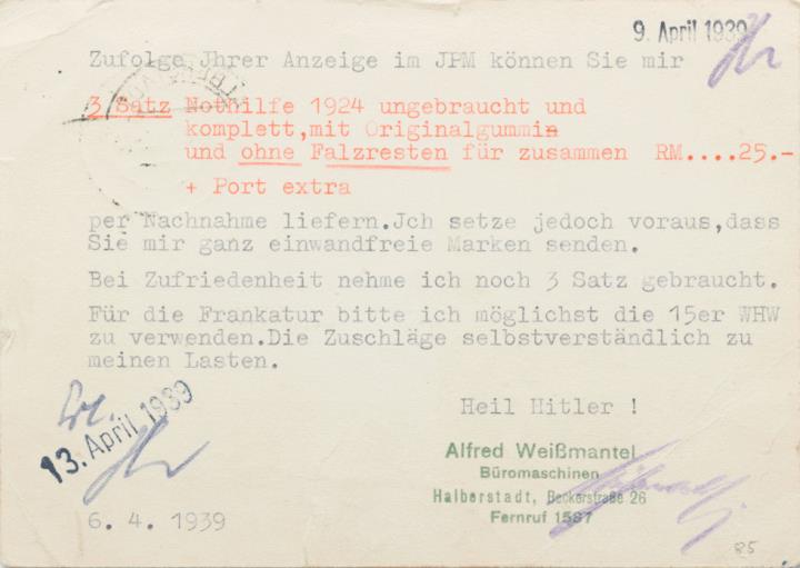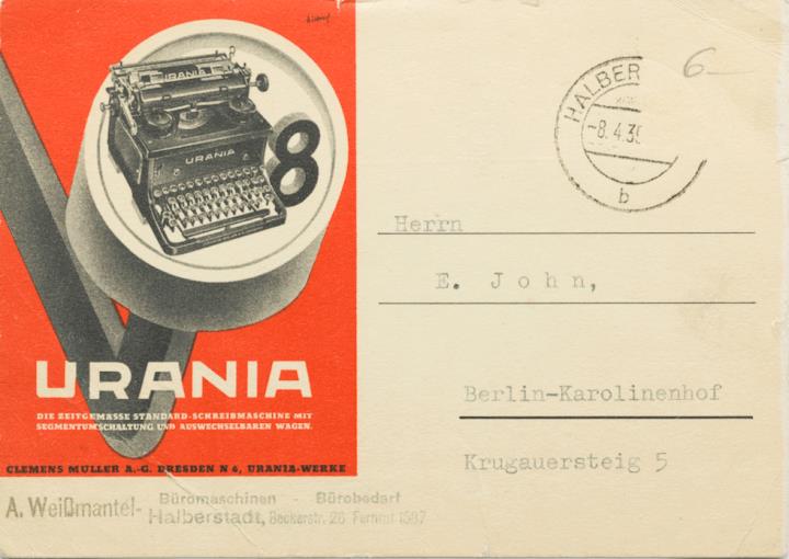 Postkarte mit Werbebild; Grafik, polychrom Vorderseite: adressiert an Herrn E. John, Berlin; Poststempel 8.4.39 Rückseite beschrieben, datiert 6.4.1939
