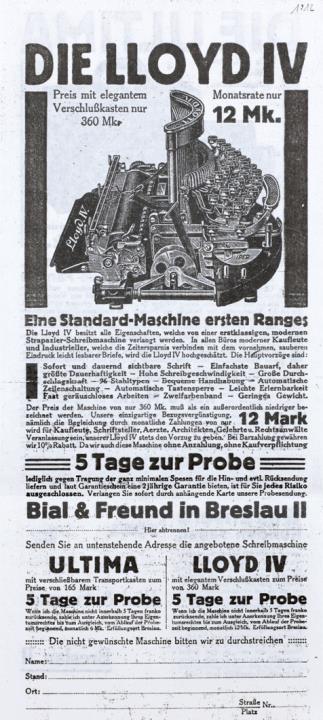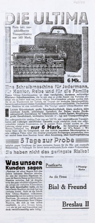 Prospekt für Schreibmaschine Ultima (Helios) Eine Schreibmaschine für Jedermann, für Kontor, Reise und für die Familie Fotokopie
