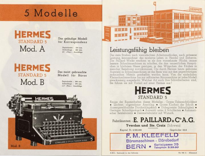Faltprospekt für Schreibmaschine Hermes Standard 5, Baby, Media und 2000 Nr. 908 A-Allemand