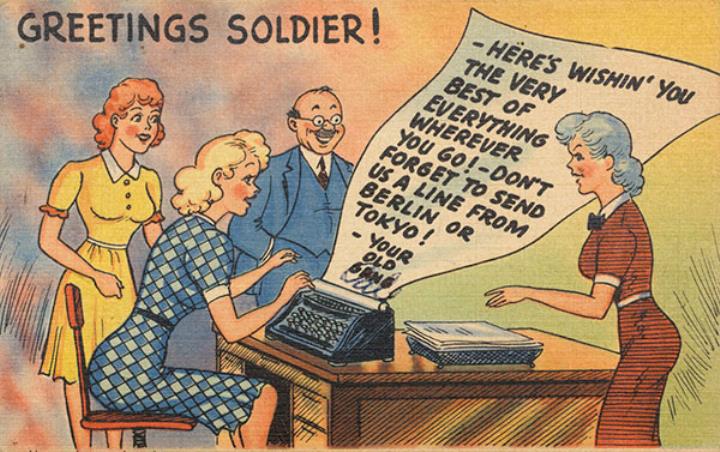 Mann, Frau, Sekretärin, Schreibmaschine, Büro, Gruß, Glückwunsch, Militär
