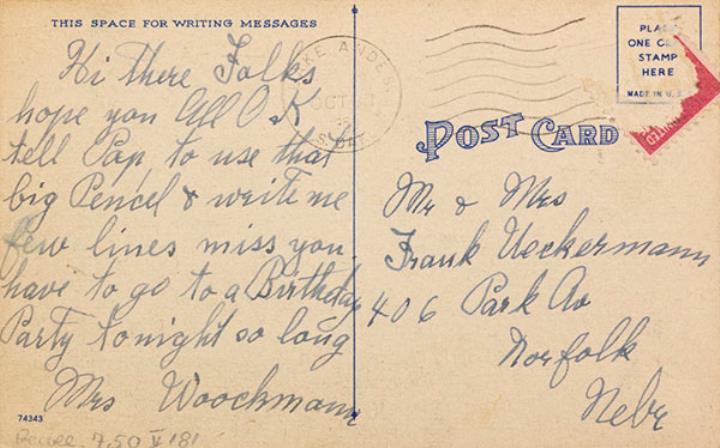 Illustrierte Postkarte; Grafik, polychrom; Nr. 74343 Rückseite: Büroszene; Vorgesetzter und Mitarbeiterinnen/Sekretärinnen mit Schreibmaschine, Briefblatt mit Grußtext Vorderseite: beschrieben; adressiert an Mr & Mrs Ueckermann, Norfolk; Poststempel Lake Andes/Oct xx 1953