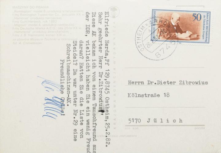 Illustrierte Postkarte; Fotocollage, polychrom Rückseite: Schreibmaschinen Remington, Kosmopolit (im Beschreibungstext: Hamonia), Mignon, Hammond; Vorderseite: beschrieben und adressiert; Briefmarke Deutsche Bundespost 50 Pf., Poststempel Ostheim/26.2.1982