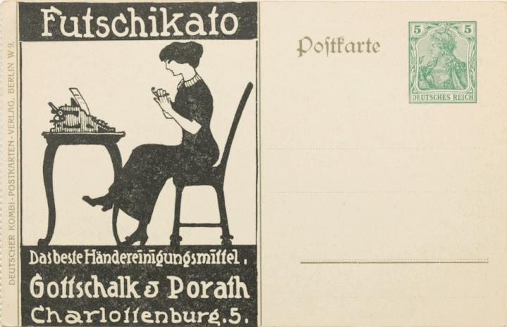 Postkarte mit Werbebild; Grafik, polychrom Vorderseite: Sekretärin mit Schreibmaschine; vorgedruckte Briefmarke Deutsches Reich 5 Pf. Rückseite nicht beschrieben
