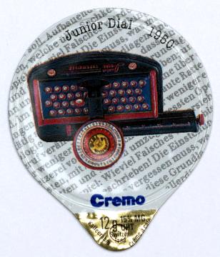 Kaffeerahmdeckel aus einer Serie (Cremo); rund mit Lasche, polychrom Motiv: Kinderschreibmaschine Junior Dial