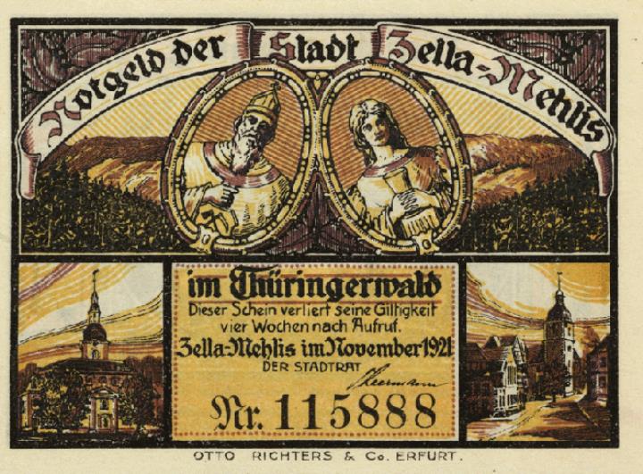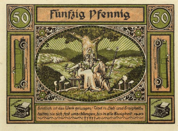 Notgeldschein Nr. 115888 der Stadt Zella-Mehlis zu 50 Pfennig von November 1921; Druck: Otto Richters & Co. Erfurt Vorderseite: romantisches Motiv mit Spruch als Hauptbild, rahmend Darstellungen von Automobil Erhardt und Schreibmaschine Mercedes