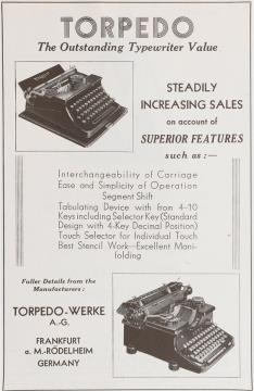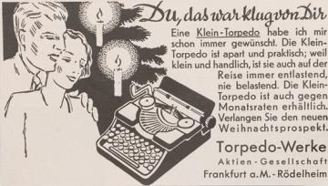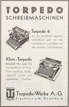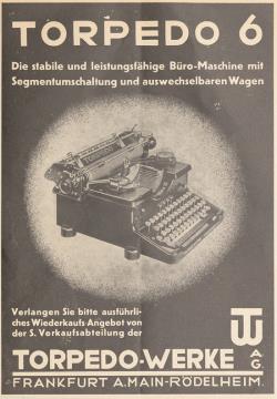Werbeanzeige für Schreibmaschine Torpedo monochrom