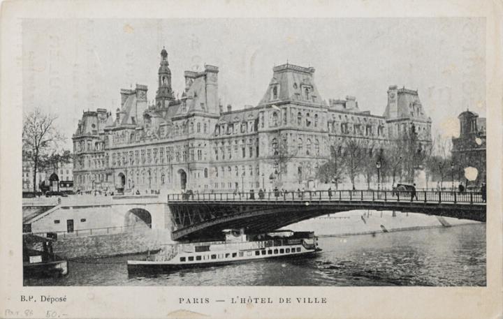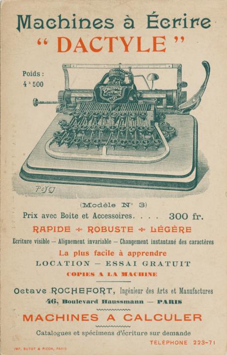 Werbepostkarte; Fotografie, Grafik, polychrom Rückseite: Schreibmaschine Dactyle, Werbetext; Vorderseite: Ansicht Paris, Hotel del Ville