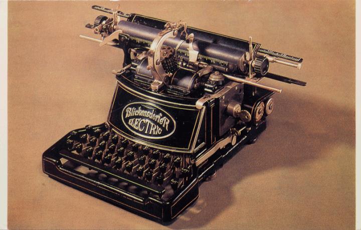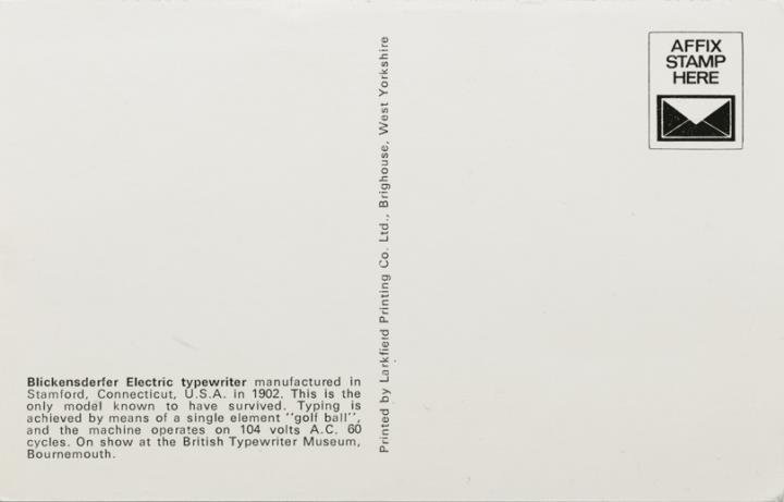 Illustrierte Postkarte; Fotografie, polychrom Rückseite: Schreibmaschine Blickensderfer Electric Vorderseite mit Beschreibungstext
