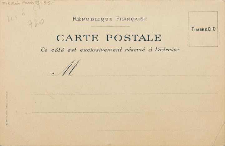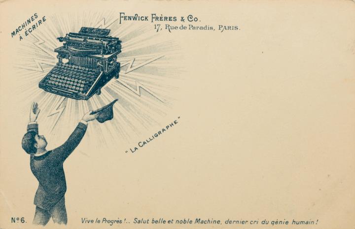 Werbepostkarte einer Serie; Grafik, monochrom; Rückseite: Mann/Sekretär mit Schreibmaschine New Century; Text Nr. 6: Vive le Progrès! [...] Vorderseite nicht beschrieben