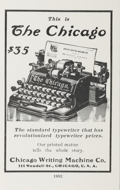 Werbepostkarte, Nachdruck; Grafik, monochrom; Rückseite: Schreibmaschine The Chicago, Werbetext, unterhalb der Rahmung die Jahreszahl 1902; Vorderseite nicht beschrieben