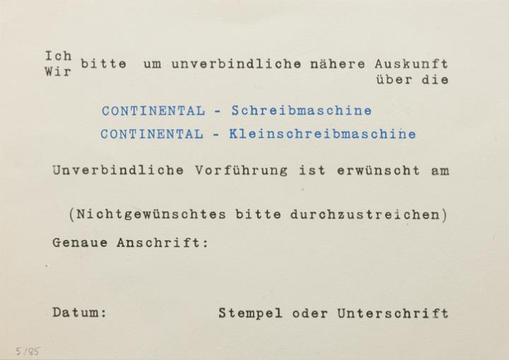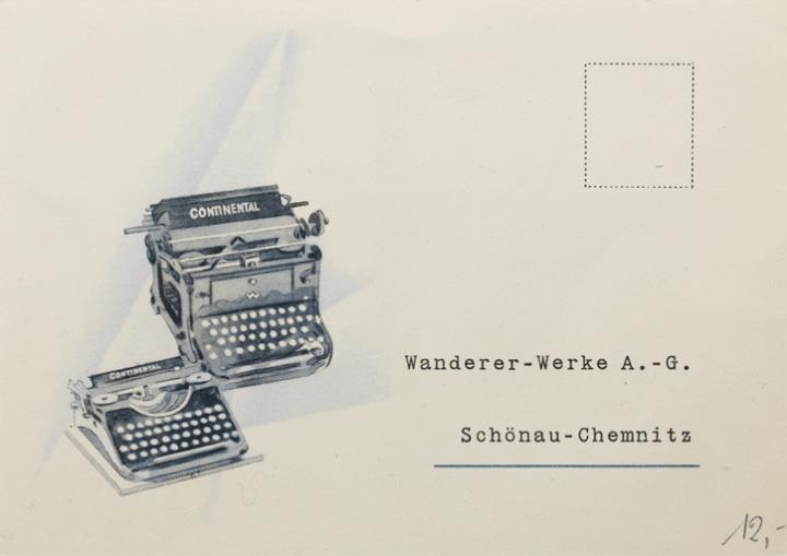 Antwortkarte; Grafik, polychrom Vorderseite: Schreibmaschinen Continental, vorgedruckte Anschrift Wanderer-Werke A.G. Schönau-Chemitz Rückseite: vorgedruckter Bestelltext