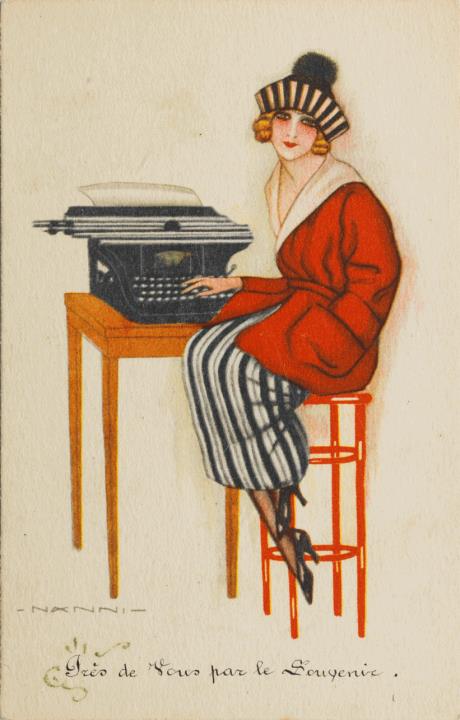 Werbepostkarte; Grafik, polychrom Rückseite: modisch gekleidete Frau mit Schreibmaschine Continental, Text: Trés de vous par le Souvenir Vorderseite nicht beschrieben