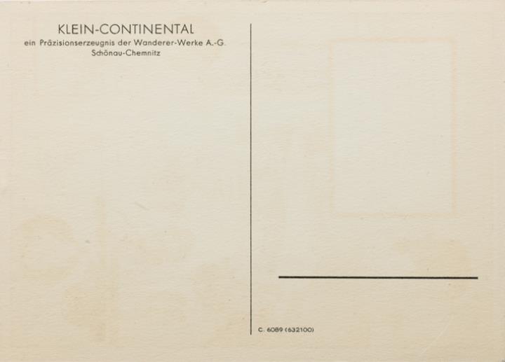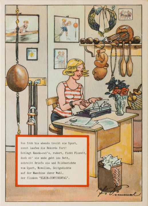Werbepostkarte; Grafik, polychrom; Nr. C 6089 Rückseite: Frau, umgeben von Sportgeräten, mit Schreibmaschine Klein-Continental; Kartusche mit Werbetext in Versform Vorderseite nicht beschrieben