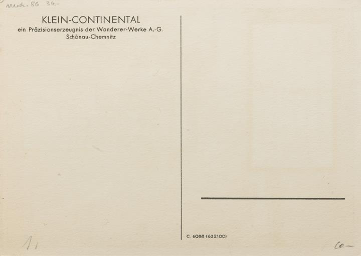 Werbepostkarte; Grafik, polychrom; Nr. C 6088 Rückseite: Mann in Büro mit Schreibmaschine Klein-Continental; Kartusche mit Werbetext in Versform Vorderseite nicht beschrieben