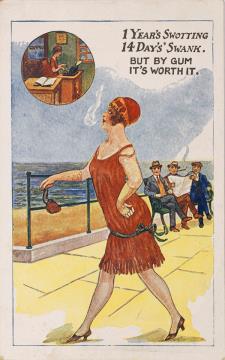 Illustrierte Postkarte; Grafik, polychrom; Rückseite: Sekretärin mit Schreibmaschine (Rundbild) und beim Spazieren entlang der Strandpromenade Vorderseite beschrieben und adressiert