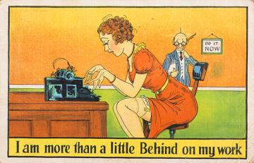 Illustrierte Postkarte; Grafik, polychrom; Series 1036-6 Rückseite: Büroszene; Sekretärin in kurzem Kleid mit Schreibmaschine, dahinter Vorgesetzter mit Akten Vorderseite: beschrieben und adressiert; Briefmarke Canada Postage 2 Cents; Poststempel Toronto/Aug 1 1939