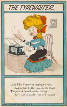 Illustrierte Postkarte; Grafik, polychrom Nr. 1142; copyright 1906 Arthur Livingston, NY Rückseite: Sekretärin mit Schreibmaschine, darunter Text in Versform Vorderseite: adressiert an Miss Stewart, Rabungap; Briefmarke U.S. Postage One Cent; Poststempel Rabungap/1907