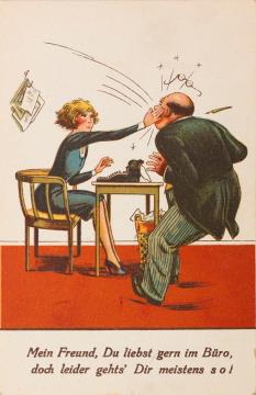 Illustrierte Postkarte; Grafik, polychrom; Nr. 1436 Rückseite: Büroszene; Sekretärin mit Schreibmaschine ohrfeigt den Vorgesetzten, weiterer Text: doch leider gehts' Dir meistens so! Vorderseite nicht beschrieben