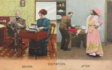 Illustrierte Postkarte; Grafik, polychrom; Nr. 1761 Rückseite: zwei Büroszenen; Vorgesetzter und Sekretärin mit Schreibmaschine / Sekretärin als Ehefrau Vorderseite: beschrieben; adressiert an Miss Thomspon, Antrim; Briefmarke U.S. Postage 1 Cent; Poststempel Antrim/Dec 24 xx