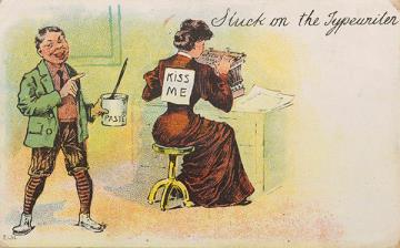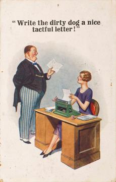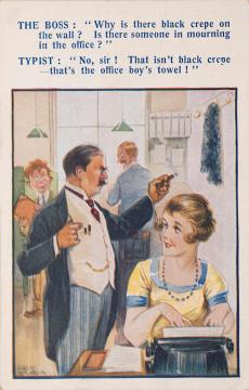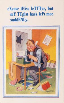 Illustrierte Postkarte; Grafik, polychrom; Nr. 1915 Rückseite: Vorgesetzter mit Schreibmaschine in verwüstetem Büro, weiterer Text: but my ttpist hass left mee suddenly Vorderseite nicht beschrieben